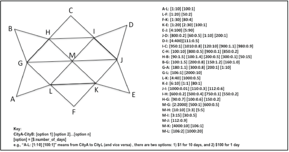 [Problem 3] ow many trip options are available, if only the total travel time needs to be considered? What are the two least-‐time trip options? What are the cities along the path and the time-‐cost for travelling between these cities?