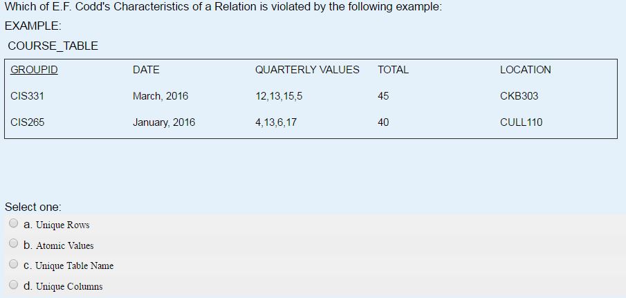 Which of E.F. Codd's Characteristics of a Relation is violated by the following example: