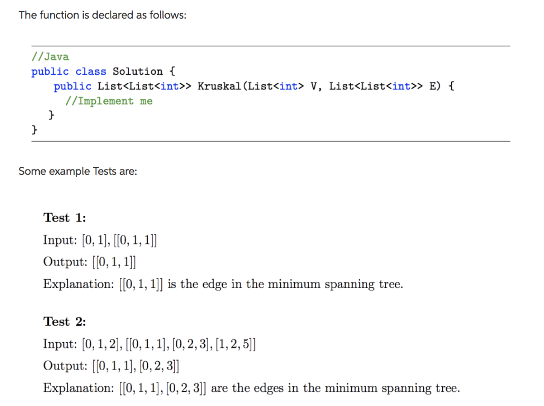 Implement Kruskal's Algorithm in Java that takes as input the nodes and edges in a graph, and outputs the minimum spanning tree. Here an edge is a 3-tuple with the first two elements being the nodes and the third the weight.
