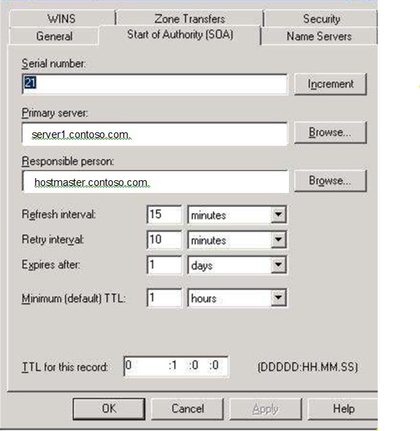 You are the network administrator for contoso.com. You have a main office in Lexington and branch offices in Danville and Paris. The Lexington office has a Windows 2012 R2 DNS server named Server1 which hosts a standard (non-Active Directory-Integrated) primary zone for contoso.com. The Danville office in has a DNS server named Server2 which hosts a standard secondary zone for contoso.com. The Paris office has a DNS server named Server3 which hosts a standard secondary zone contoso.com. The SOA record for the contoso.com zone is displayed below.