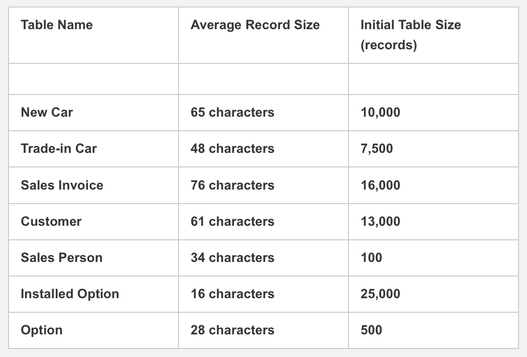 The new system under development for Xtreme Cars has seven tables that will be implemented in a relational database. The expected average record size of these tables and the initial record count per table are given next.