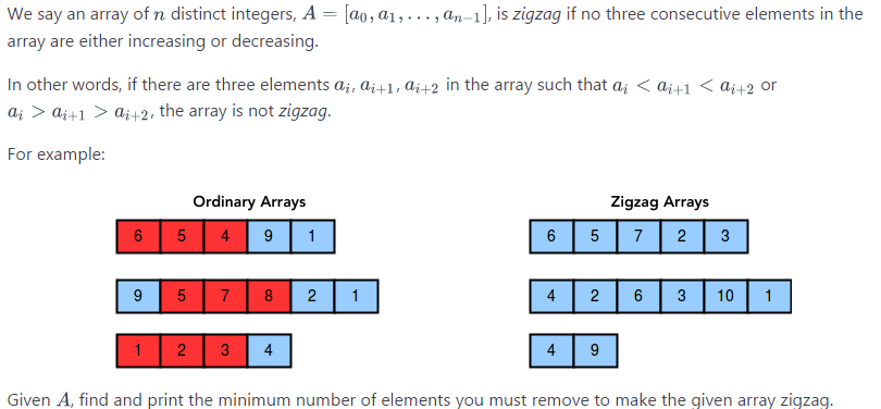 We say an array of distinct integers, , is zigzag if no three consecutive elements in the array are either increasing or decreasing.