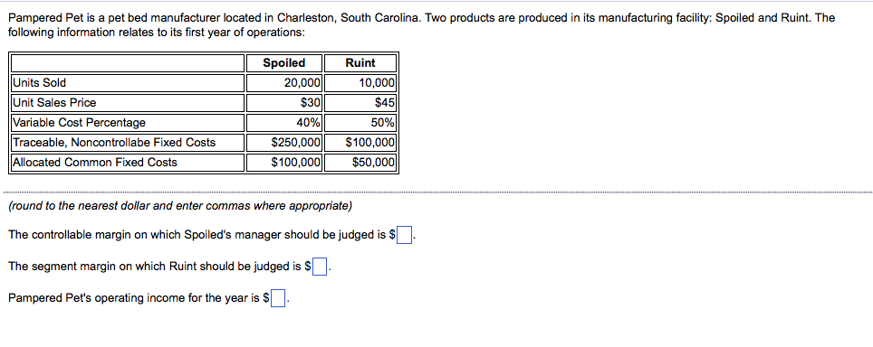 Pampered Pet is a pet bed manufacturer located in Charleston, South Carolina. Two products are produced in its manufacturing facility: Spoiled and Ruint. The following information relates to its first year of operations: