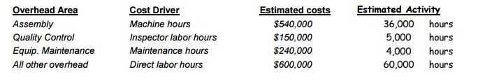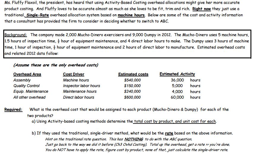Background: The company made 2,000 Mucho-Dinero exercisers and 9,000 Dumpy in 2012. The Mucho-Dinero uses 5 machine hours,1.5 hours of inspection time, ½ hour of equipment maintenance, and 4 direct labor hours to make. The Dumpy uses 3 hours of machine time, 1 hour of inspection, ½ hour of equipment maintenance and 2 hours of direct labor to manufacture. Estimated overhead costs and related 2012 data follow: (ATTACHED)