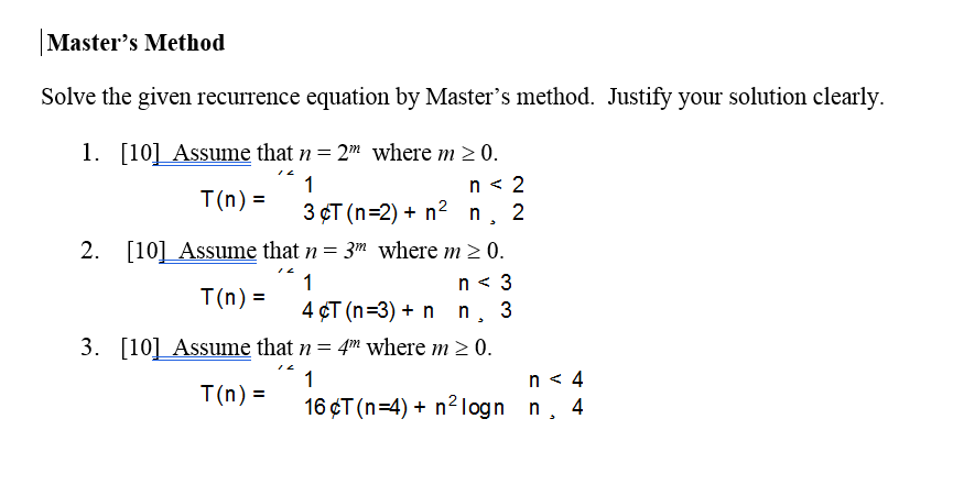 Solve the given recurrence equation by Master’s method. Justify your solution clearly.