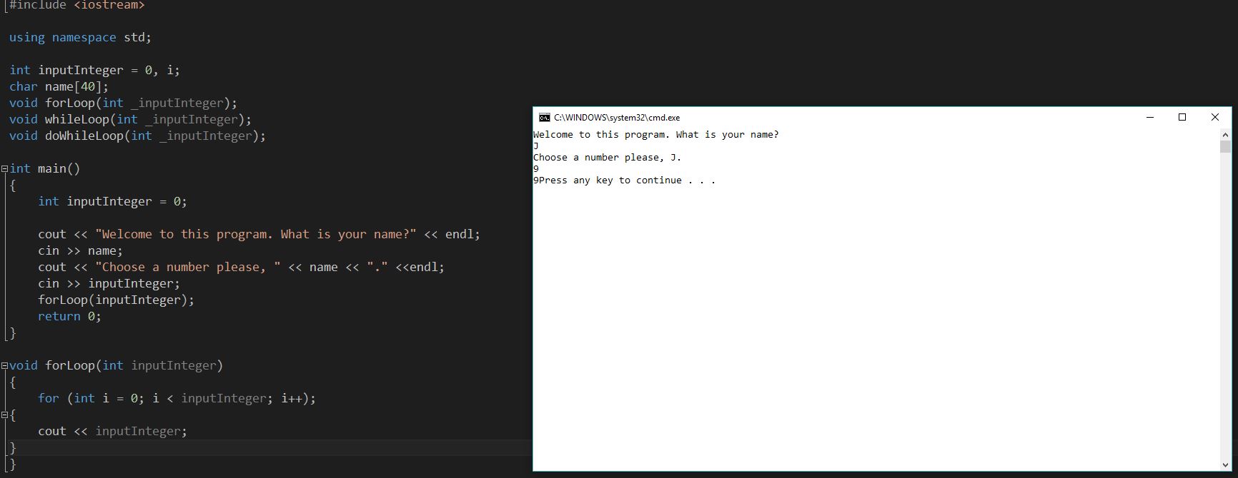 The functions in my code are not incrementing. If the user inputs 9 as the "inputInteger" the functions should increment the initialized i variable until it reaches  9. The display should be 1 2 3 4 5 6 7 8 9 for all three loops. Please let me know what I am doing wrong. This is C++.