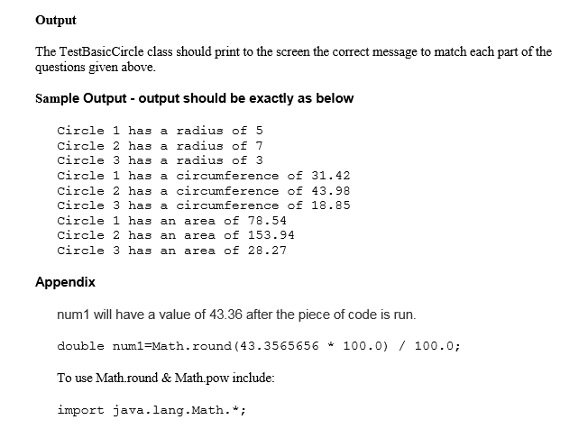 vi). A method called getArea to calculate and return the area of the Circle to 3 decimal places (see appendix). You should use Math.PI in this method. Â
