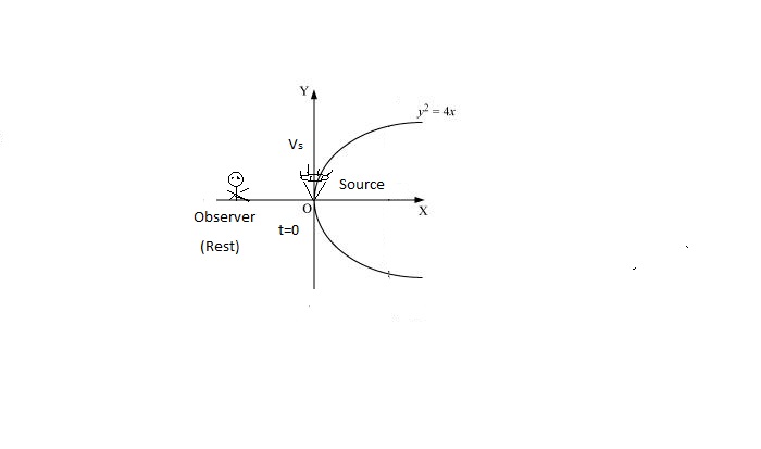 Consider a standard Cartesian coordinate system (the xy plane). A sound source is moving on a parabolic path y2=4x with constant speed vs=v2. Here v is velocity of sound in still air. At time t=0 the source is at the origin, and an observer is standing at rest at (−1,0). Find the time at which the observer hears the **lowest** frequency he'll hear from the source. The time T can be expressed as