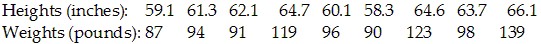 The heights (in inches) and weights (in pounds) of nine randomly selected thirteen-year old girls are listed below. Find the coefficient of variation for each of the two sets of data (rounding to one decimal place), then compare the variation in heights to the variation in weights.
