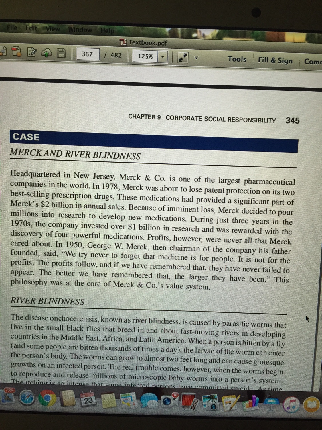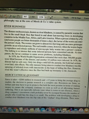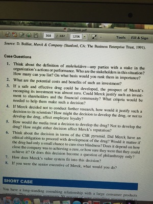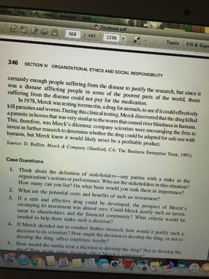 For this assignment, you need to read the Merck River Blindness case study on page 345 of your textbook. The Sorrell College of Business requires you to answer questions one and eight after the case study. The case study presents an ethical dilemma facing Merck, a major pharmaceutical company. This assignment requires you to identify stakeholders who will be affected by whatever decision the company makes, prioritize their interests, and then recommend and justify a decision on how to proceed. Think about how the relevant stakeholders could be impacted by Merck's decision. You should put yourselves in each stakeholder's position--Why do they care about the outcome of the decision? How will they be affected? What outcome would they prefer? What are their arguments in support of their preferred outcome? Then, you will be asked to consider the decision from the perspective of Merck. This means you will need to evaluate the competing claims of stakeholders, rank their importance, and reach a decision on how to proceed. You should use your evaluation of each stakeholder's interests to justify your ultimate decision. Use the information the case gives you about the company to reach a decision, and cite this information in the arguments you make to justify your decision. Finally, you will need to address the implications of your decision--Make sure you've described how your decision will likely impact key stakeholders, and why even negative impacts did not impact the decision you reached.