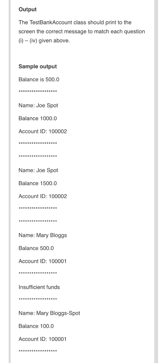 C&O: Bank Account: a) Write a class to represent a bank account (called BankAccount.java). This should include the following: i. Three attributes as follows: an attribute called name for the name of the bank account holder of type String, an attribute called balance of type double and a unique accountID of type int. The first value for the account ID should be 100001 and all subsequent bank accounts IDs that are created should be a unique value, in increments of 1. ii. A constructor which takes two parameters, one for the name and one for the balance. The balance must be greater than 0 (use the setBalance(<…>) method in (vii) below to check the balance is valid. The constructor should also set the value of a unique accountID. iii. Getter and setter methods for the name and balance (getName(), setName(<…>), getBalance(), setBalance(<…>). iv. A method to make a deposit called deposit(<…>). The method should accept a double as a parameter and add the value to balance. v. A method to make a withdrawal called withdrawal(<…>). The method should accept a double and reduce the balance by this amount if the balance is large enough to do so. vi. A method called print() that prints the name, balance and accountID. b) Write a new class called TestBankAccount.java. In the main method i. Create a bank account for “Mary Bloggs” with an initial balance of €500 and create another bank account for “Joe Spot” with an initial balance of €1000. ii. Print Marys balance to the screen using the getBalance() method iii. Print the details of Joes account using the print() method iv. Make a deposit in Joes account using the deposit(<…>) method for €500 and print his account details account v. Print Marys account details using the print() method vi. Withdraw €600 from Marys account using the withdraw(…) method – what happens? vii. Withdraw €400 from Marys account using the withdraw(…) method. viii. Mary and Joe get married. Set Mary’s new name to “Mary Bloggs-Spot” using the setName(<…>) method and print her account details again using the print() method