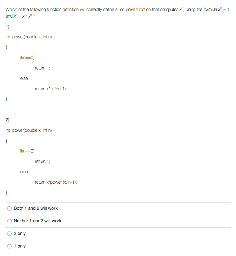 Which of the following function definition will correctly define a recursive function that computes xn, using the formula x0 = 1 and xn = x * xn–1 Â