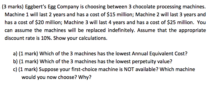 b) (1 mark) Which of the 3 machines has the lowest perpetuity value?