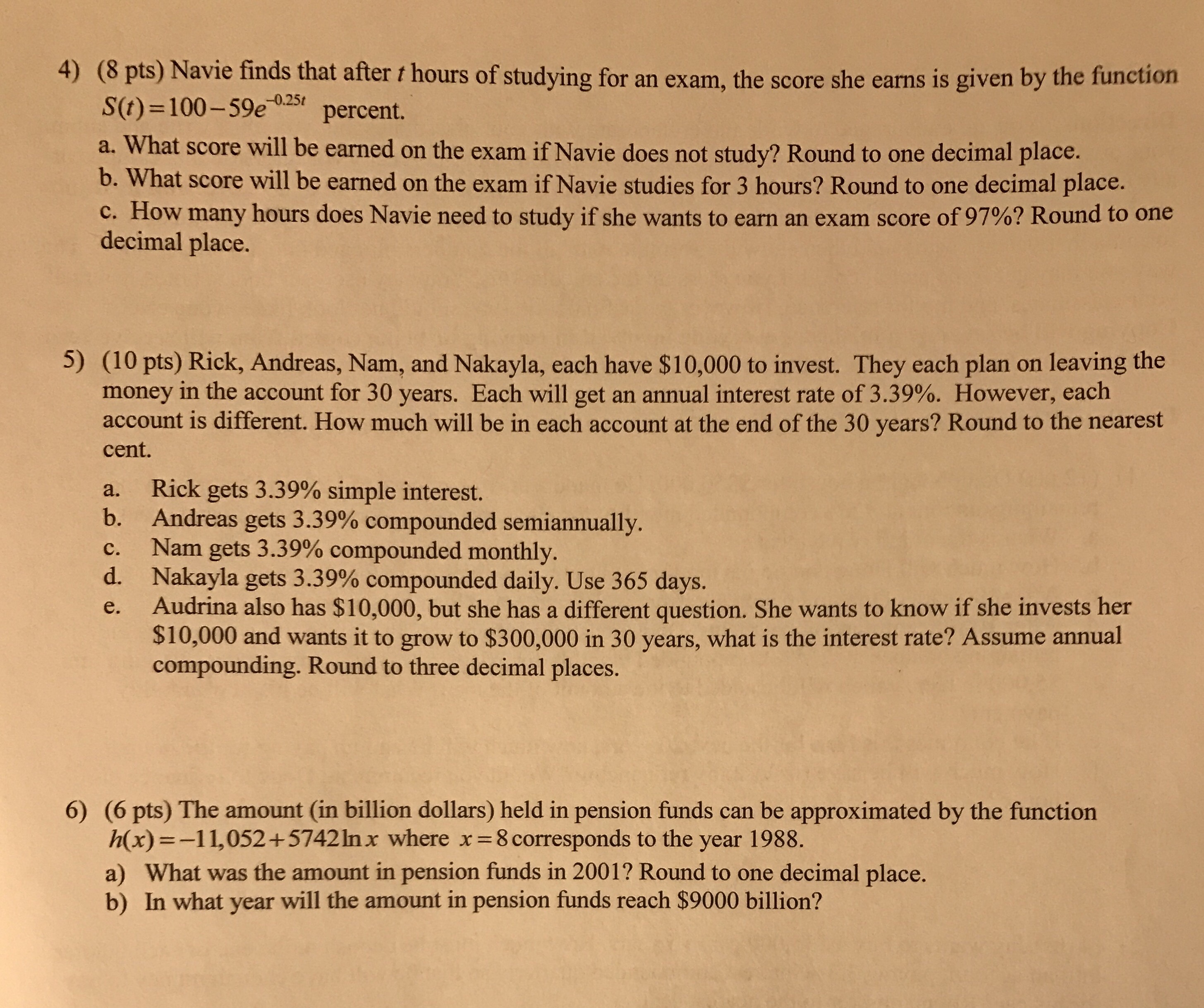Navie finds that after t hours of studying for an exam, the score she earns is given by function S(t)=100-59e^-0.25t percent