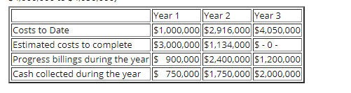During Year 1, Sparky Construction Company has a contract to construct a $4,500,000 high-rise apartment building at an estimated cost of $4,000,000. The contract is to start in July of Year 1 and the high-rise apartment building is to be completed in October of Year 3. The following data pertain to the construction period (Note: by the end of Year 2, Sparky has revised the estimated total cost from $4,000,000 to $4,050,000)