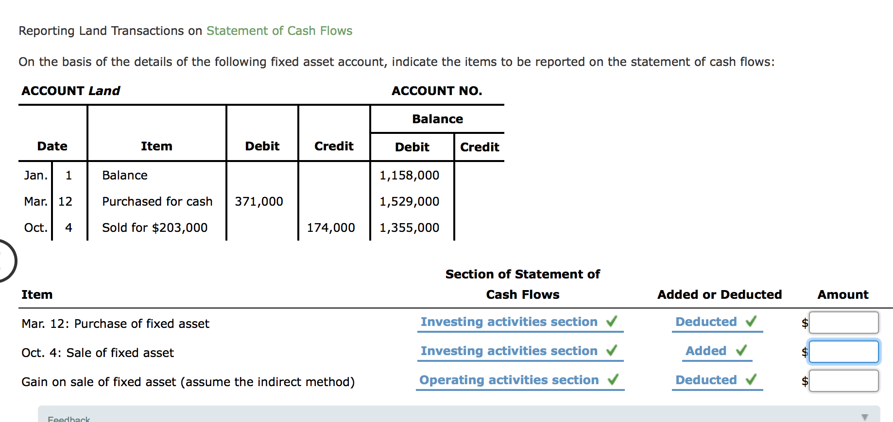 Reporting Land Transactions on Statement of Cash Flows On the basis of the details of the following fixed asset account, indicate the items to be reported on the statement of cash flows: ACCOUNT Land Mar. 12 Purchased for cash 371,000 Sold for $203,000 174,000 Item