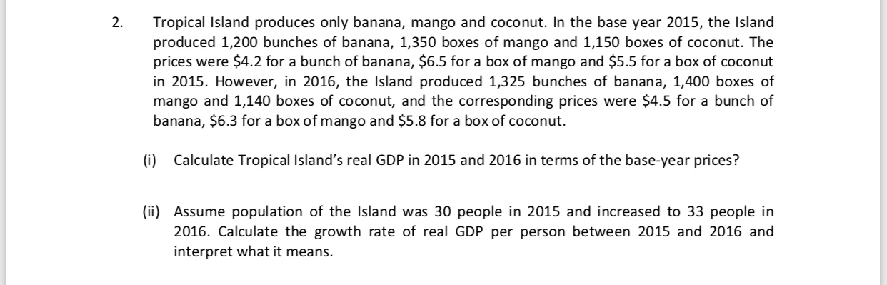 2. Tropical Island produces only banana, mango and coconut. In the base year 2015, the Island produced 1,200 bunches of banana, 1,350 boxes of mango and 1,150 boxes of coconut. The prices were $4.2 for a bunch of banana, $6.5 for a box of mango and $5.5 for a box of coconut in 2015. However, in 2016, the Island produced 1,325 bunches of banana, 1,400 boxes of mango and 1,140 boxes of coconut, and the corresponding prices were $4.5 for a bunch of banana, $6.3 for a box of mango and $5.8 for a box of coconut. (i) Calculate Tropical Island's real GDP in 2015 and 2016 in terms of the base-year prices? (ii) Assume population of the Island was 30 people in 2015 and increased to 33 people in 2016. Calculate the growth rate of real GDP per person between 2015 and 2016 and interpret what it means.