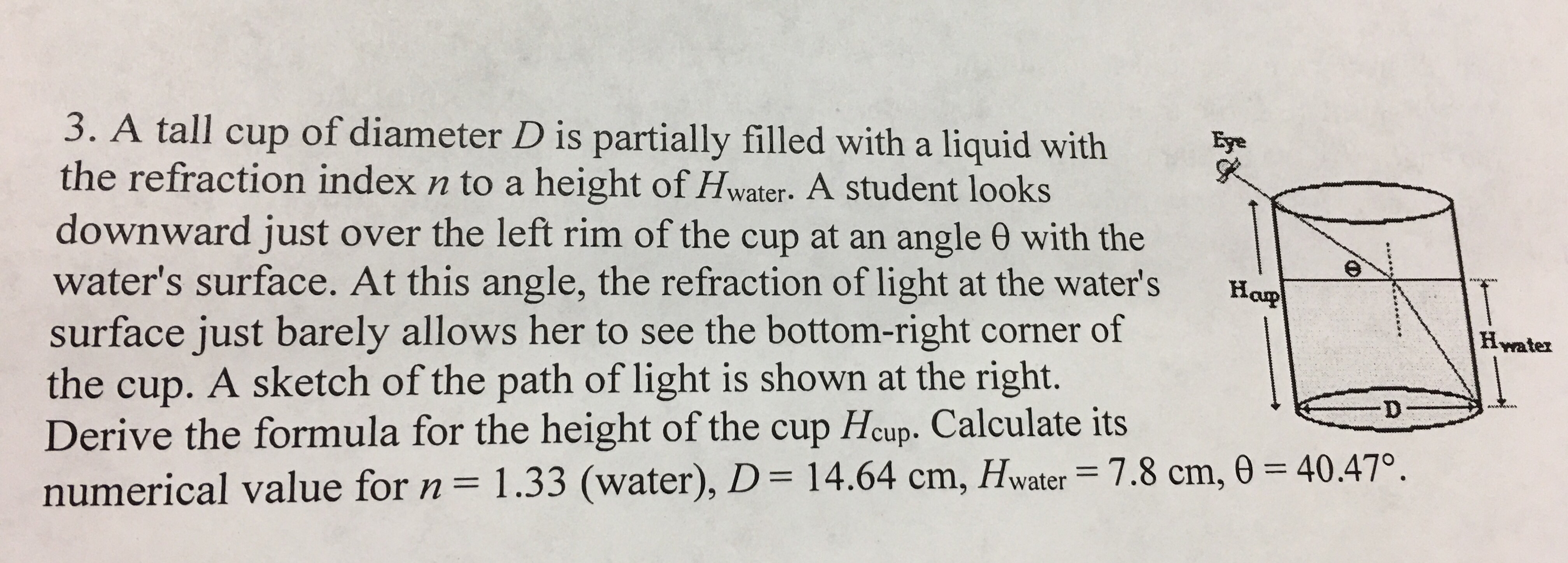 A tall cup of diameter D is partially filled with a liquid with the refraction index n to a height of Hwater. A student looks downward just over the left rim of the cup at an angle pheta with the water's surface. At this angle, the refraction of light at the water's surface just barely allows her to see the bottom-right corner of the cup. A sketch of the path of light is shown in the image. Derive the formula for the height of the cup Hcup. Calculate its numerical value for n = 1.33 (water), D = 14.64 cm, Hwater = 7.8 cm, and angle pheta = 40.47 degrees.