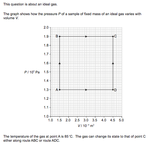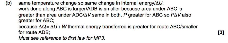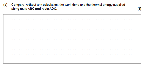 I am reviewing for a physics exam that I have soon and I don't understand the question below. When I tried answering it I wrote that the work was the same because if we use vectors for the diagram, AB+BC= AD+DC (the diagonal). However, that is not right. I looked at the answer and I don't understand why the work is the same. If I use the equation W= delta Q - delta U , as the change in the temperature and the change in the internal energy are the same (as specified in the answer), shouldn't the work be = 0? I don't understand why the area can be used to show that the work is greater for ABC. Could someone help me understand it?
