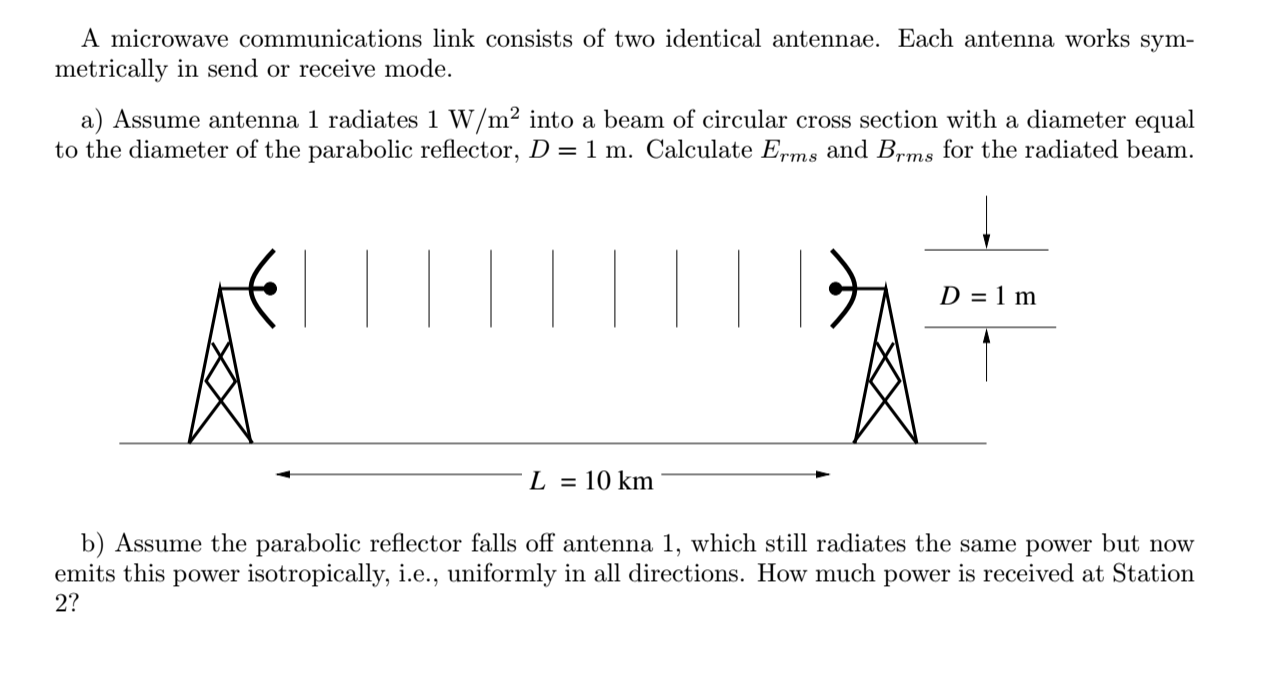 A microwave communications link consists of two identical antennae. Each antenna works sym-