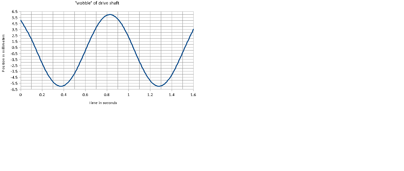 The graph shows a small portion of a data run to diagnose a faulty drive shaft that develops a ‘wobble’ as it is rotated. The shaft is rotated at a fixed frequency and a periodic oscillation develops that causes the shaft to move perpendicular to the axis of rotation.