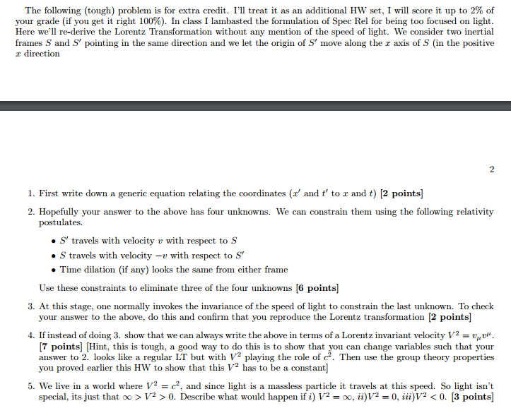 your answer to the above, do this and confirm that you reproduoe the Lorentz transformation [2 points] 4. ifinstead of doing 3. show that we can always write the above in terms of a. Lorentz invariant velocity V2 = ope“ .