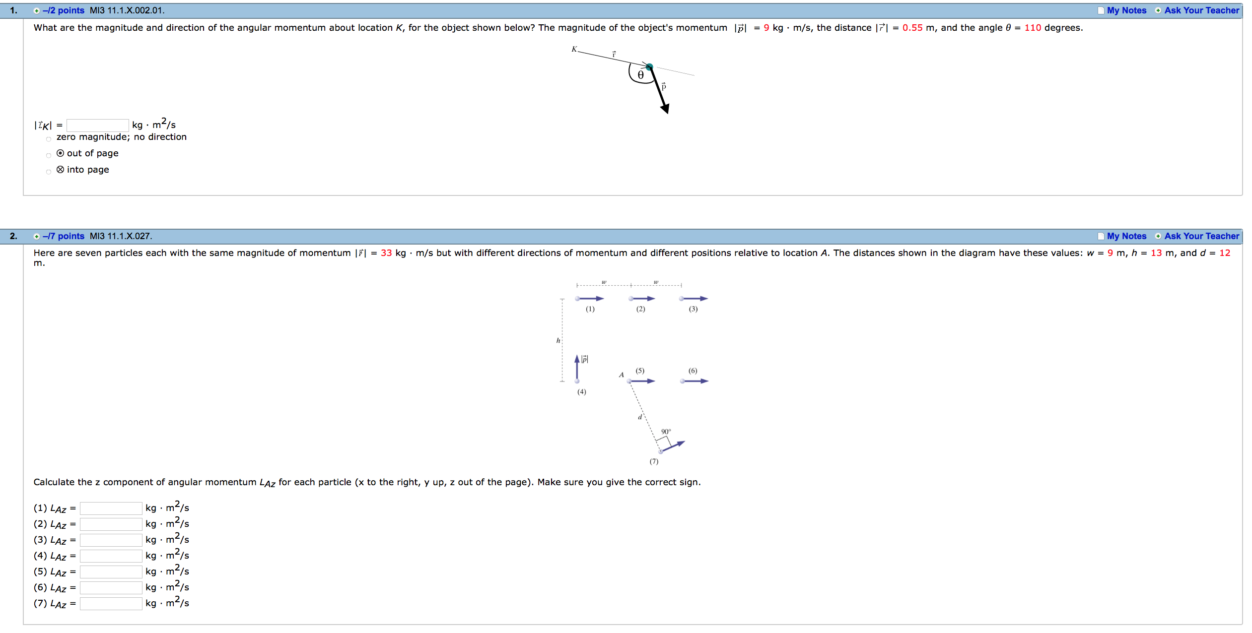 m. (7) Calculate the 2 component of angular momentum LA; for each particle (x to the right, y up, 2 out of the page), Make sure you give the correct slant (1) M2 = kn - mz/s