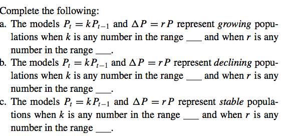 Cemplete the fulluwing: a. The models P, = kP,_1 and flP = 3".” represent gmwing popu- latiens when k is any number in the range _ and when r is any