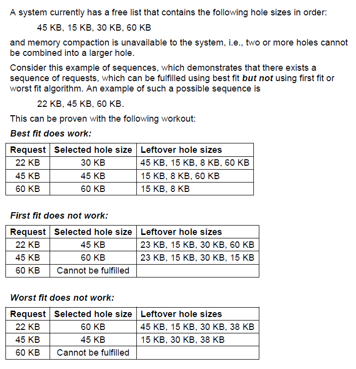 Using the same approach as shown above, find a sequence of precisely 4 requests, which can be fulfilled using first fit but not using best fit or worst fit algorithm.