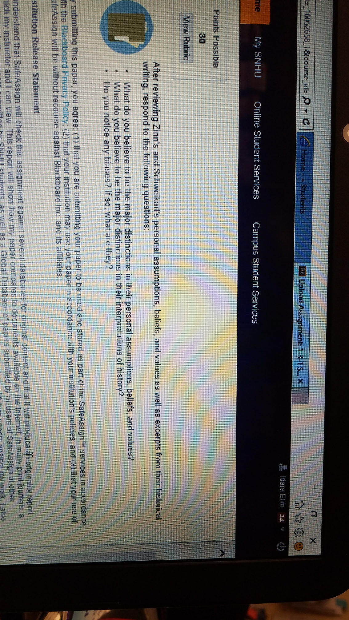After reviewing Zinn's and Scweikart's personal assumptions, beliefs and values as well as excerpts from their historical writing, respond to the following questions: 1. What do you believe to be the major distinctions in their personal assumptions, beliefs, and values? 2. What do you believe to be the major distinctions in their interpretations of history? 3. Do you notice any biases? If, what are they?