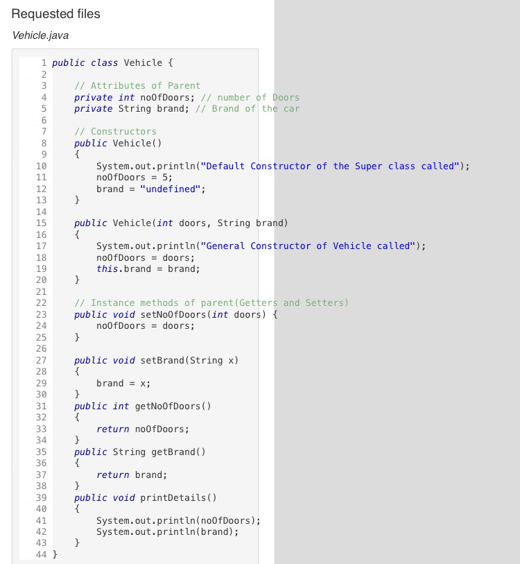 Inheritance 1: Vehicle: A Vehicle class has been pre-coded in VPL. Within this class there are attributes, an integer noOfDoors representing the number of doors on a vehicle and a String brand representing the car’s brand. There is a Default and General Constructor along with relevant Getter and Setter Methods. This will act as a Parent Class from which you will inherit from with Car and SUV classes. Some methods and constructors are pre-coded for you and do not need to be changed. You should read through Vehicle.java and the pre-coded sections of each other class. a) In the car class: Make the Car class allow inheritance from Vehicle using a keyword. Create a Boolean attribute in Car called sportsModel that is true if the car is a sports model otherwise false. Write a default constructor for Car which should use the keyword super to invoke Vehicles constructor and sets sportsModel to false. Look at Vehicles General Constructor to see what the parameters are for correct use. A second constructor with an integer parameter, a String parameter and a boolean parameter. These parameters invoke Vehicles General Constructor and set sportsModel to the Boolean parameter. b) In the SUV class: Make the SUV class allow inheritance from Vehicle using a keyword. Write a default constructor for SUV that takes in an integer, and 2 Strings as parameters. wheelDrive should equal the 2nd String. wheelDrive represents whether the drive of SUV is “rear”, “front” or “4”. The other two parameters will be used for Vehicle’s constructor. Create getter and setter methods for wheelDrive with the signature getDrive() and setDrive(<…>). c) Create a tester class Tester which is a simple program with only a main method. Create a SUV object called suv1 using it’s default constructor. Create another SUV object using the general constructor, called suv2, with the values 2 for number of doors, “Nissan” for brand and “4” to represent 4-wheel-drive. Create a Car object called car1 with the values 3, “Ford” and true (to represent sports model). Use the relevant setter method to set suv1’s brand to “BMW”. Set the drive to “rear” and set noOfDoors to 5. Use Vehicle’s printDetails() method to print out suv1’s details and use getDrive() and a print statement to print suv1’s wheelDrive. See sample output. Set car1’s noOfDoors to 5. Use printDetails() on car1. Use a print statement and isSportsModel() to show whether car1 is a sportsModel. See sample output. Note: Notice how you are able to use Vehicle’s constructors as part of your more specific Car and SUV constructors. You are able to use Vehicle’s methods with the Car and SUV objects you created. Notice with the print statements in Vehicle’s constructors whether the general or default constructor is being invoked. Sample output: Default Constructor of the Super class called General Constructor of Vehicle called General Constructor of Vehicle called 5 BMW rear 5 Ford false