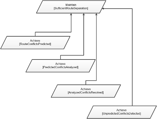 onsider the following goal model fragment for an air traffic control system shown below. The parent goal roughly states that aircraft routes should be sufficiently separated. The refinement is intended to produce sub-goals for continually separating routes based on different kinds of conflict among routes.