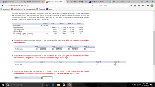 The Best Manufacturing Company is considering a new investment. Financial projections for the investment are tabulated here. The corporate tax rate is 34 percent. Assume all sales revenue is received in cash, all operating costs and income taxes are paid in cash, and all cash flows occur at the end of the year. All net working capital is recovered at the end of the project.