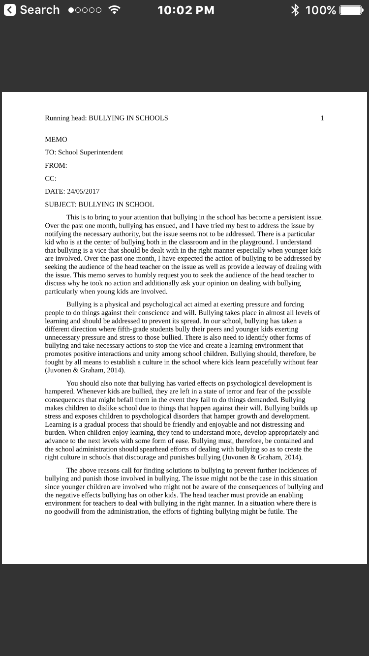 Search 0 >3 100% [:1- Running heat]: EULLYING IN SCHOOLS MEMO T0: School Superintendent FROM: CC: DATE: Malia-“201? SUBJEC'I‘. BULLYING lN SCHUOI. This is to bring to your attention that bullying in the school has become a persistent issue.