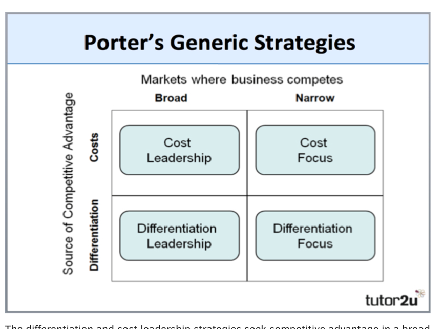 By and large, most companies are not in a position to forget about the competition as we discussed in the previous topic. Most companies find success when they find and keep a competitive advantage, Here's a link Competitive Advantage Tutorial to further describe competitive advantage and Porter's generic categories of competitive advantage illustrated bellow: