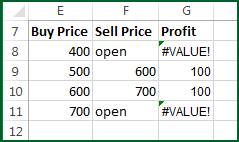 In the spreadsheet shown below, we computed profit earned by selling houses by entering the formula =F8-E8 in cell G8 and copying it down to G9:G11. We used the word open to denote a house that is not yet sold. Unfortunately, when a house has not yet been sold our spreadsheet shows the #VALUE error, because you cannot subtract the buy price from the word open. We would like to "error trap" Column G so that when a house has been sold the correct profit has been computed and if the house has not yet been sold a _ will be entered in Column G. How many of the following formulas could be entered in cell G8 and copied down to G9:G11 to achieve this goal?