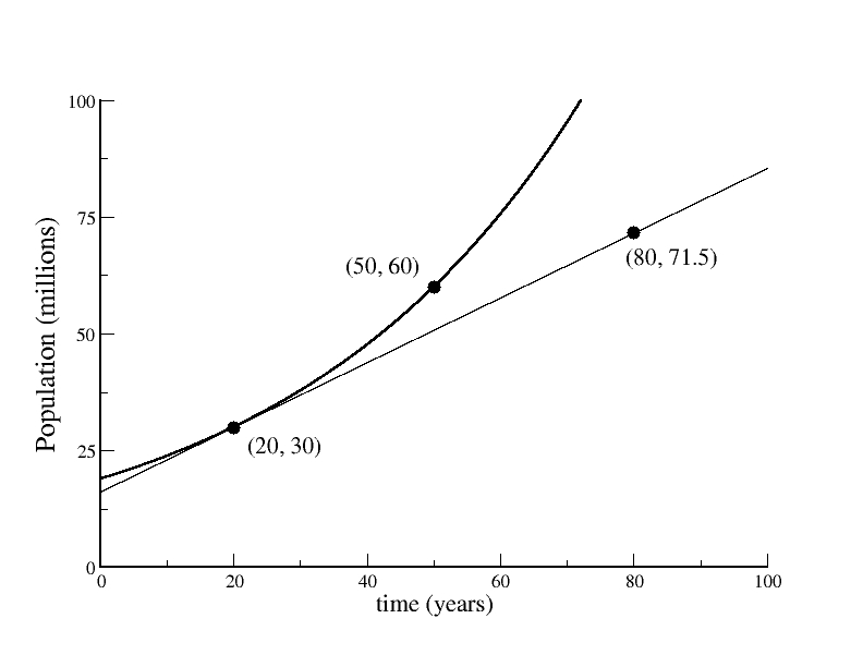 The labeled points on the curve show the country's population in 1920 (30 millions) and in 1950 (60 millions).