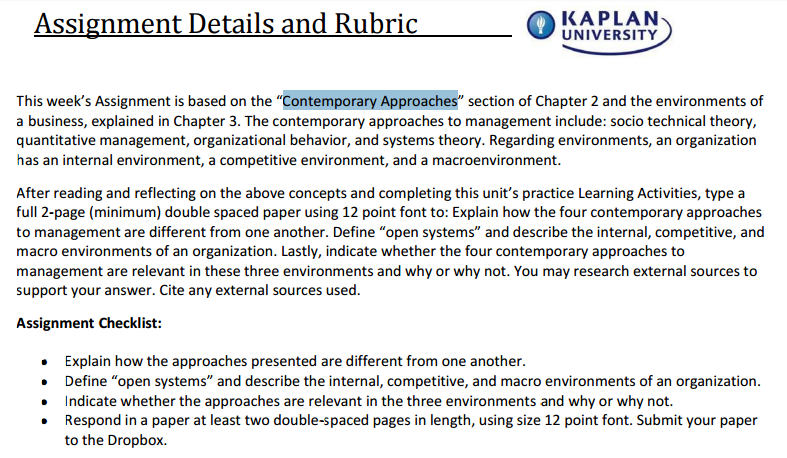 This week’s Assignment is based on the “Contemporary Approaches” section of Chapter 2 and the environments of a business, explained in Chapter 3. The contemporary approaches to management include: socio technical theory, quantitative management, organizational behavior, and systems theory. Regarding environments, an organization has an internal environment, a competitive environment, and a macroenvironment. After reading and reflecting on the above concepts and completing this unit’s practice Learning Activities, type a full 2-page (minimum) double spaced paper using 12 point font to: Explain how the four contemporary approaches to management are different from one another. Define “open systems” and describe the internal, competitive, and macro environments of an organization. Lastly, indicate whether the four contemporary approaches to management are relevant in these three environments and why or why not. You may research external sources to support your answer. Cite any external sources used.