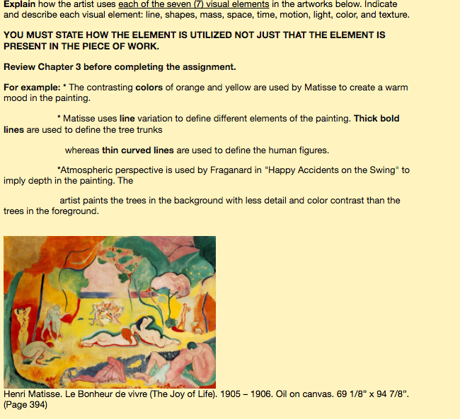 PRESENT IN THE PIEGE DF WORK. Review chapter 3 before eemple'ting the assignment. Fer example: ‘ The centrasting eelere of orange and yellow are used by Matisse to create a want]