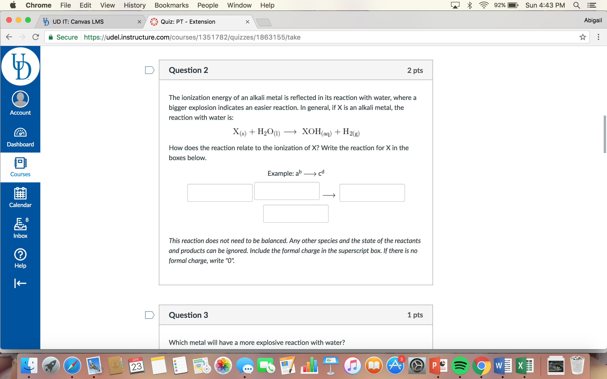 . . Chrome File Edit View History Bookmarks People Window Help L2! >3 ’6? 92% - Sun 4:43 PM Q ‘ [ . ® . ‘fi 11;) meanmlgMS X>/ 6:3 Quiz: PT - Extension X D Abi93“ 6 C‘ | 6 Secure https:/lude|.instructure.com/courses/1351782/quizzes/1863155/take 1}] E w :> Question 2 2 pts The ionization energy of an alkali metal is reflected in its reaction with water, where a