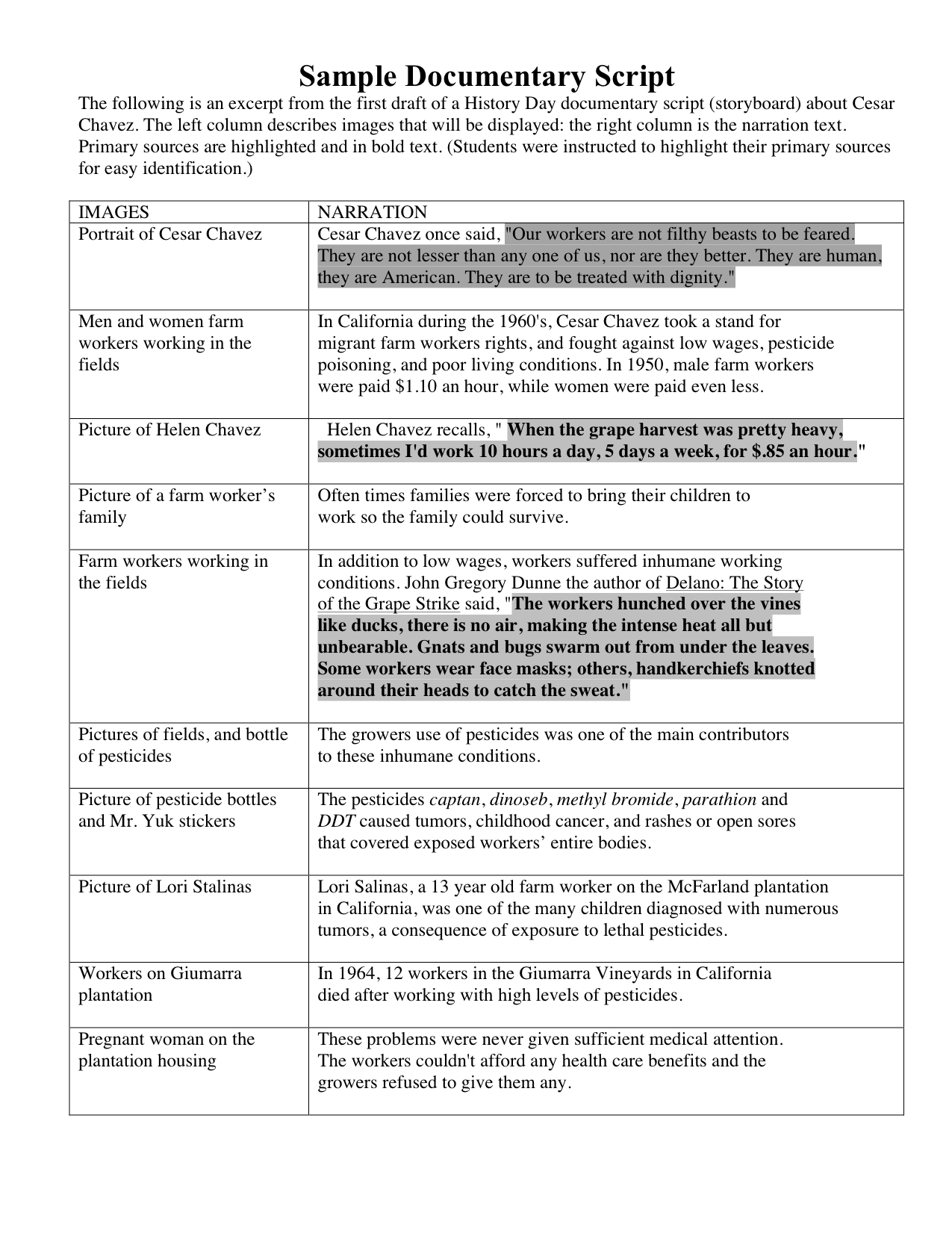 Notice that direct quotes from the paper are included in the script, and they are highlighted. Please do that also. In the Images column, ideas for visual aids are listed.