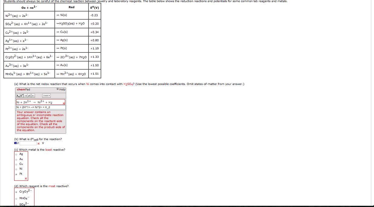 H (a) What is the net reflux reach'on that ooours whEn Ni comes. into cantaot with H2904? (Use the lamest possible Dneffic'tents. Omit auteur-hatter frum wur answer] chumPad 3 Heip