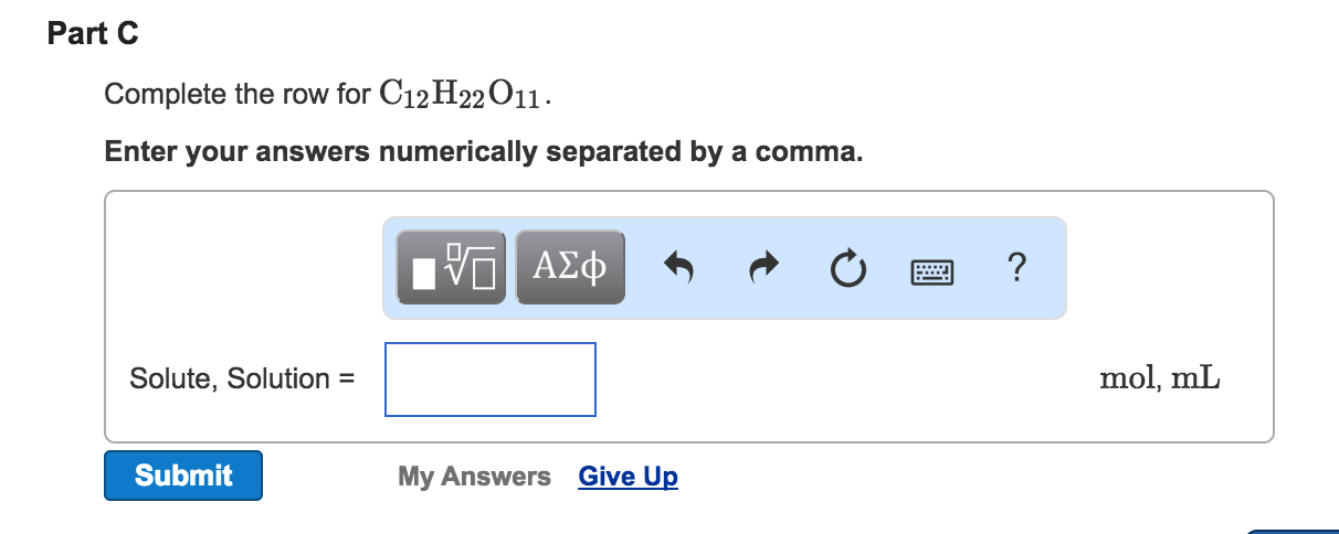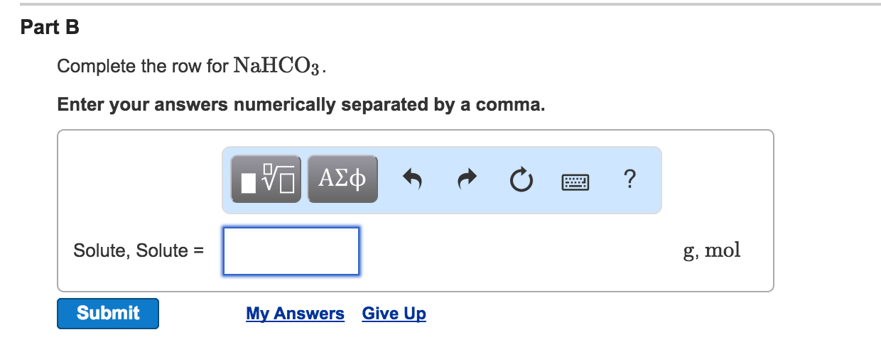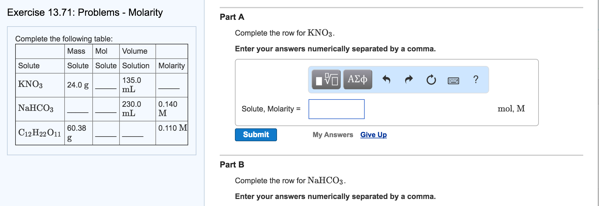 Complete the row for KNOa. Enter your answers numerically separated by a comma. .Azrb-«oo? Solute, Molarity = |:| mol, M m My Answers Give Up Part B