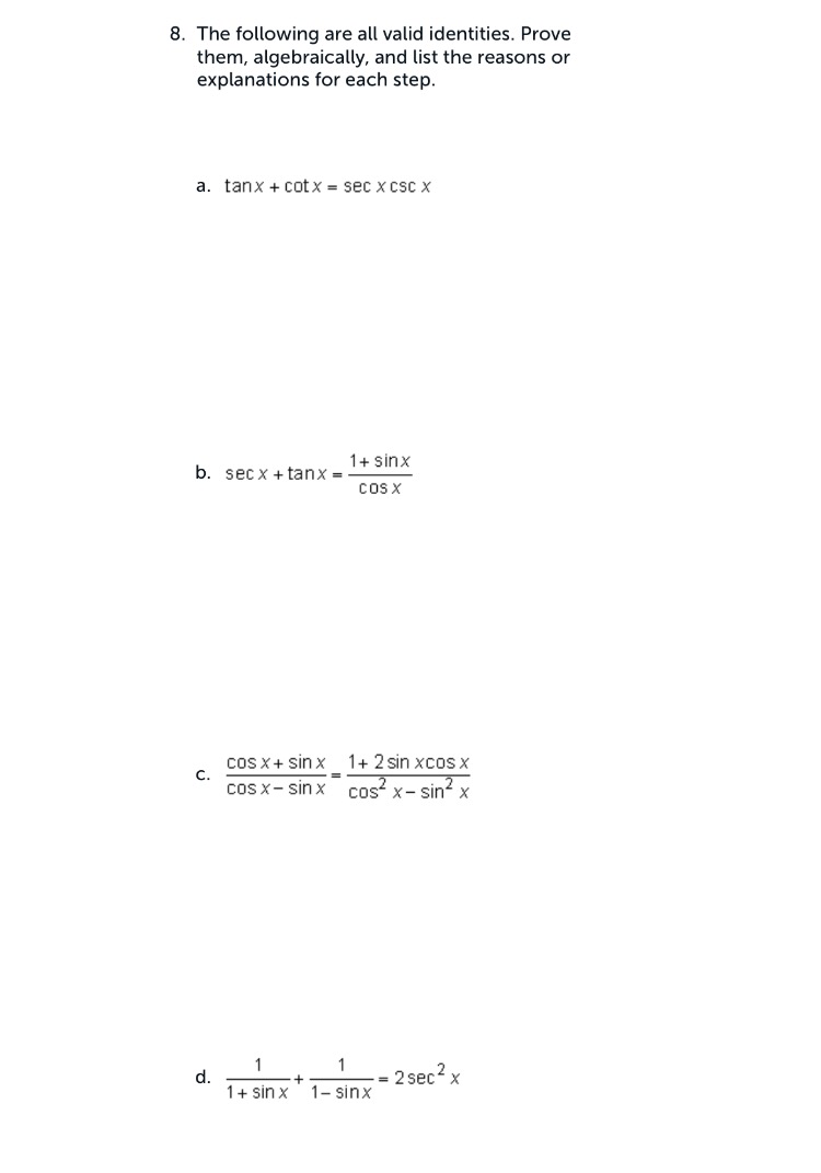 B. The following are all valid identities. Prove