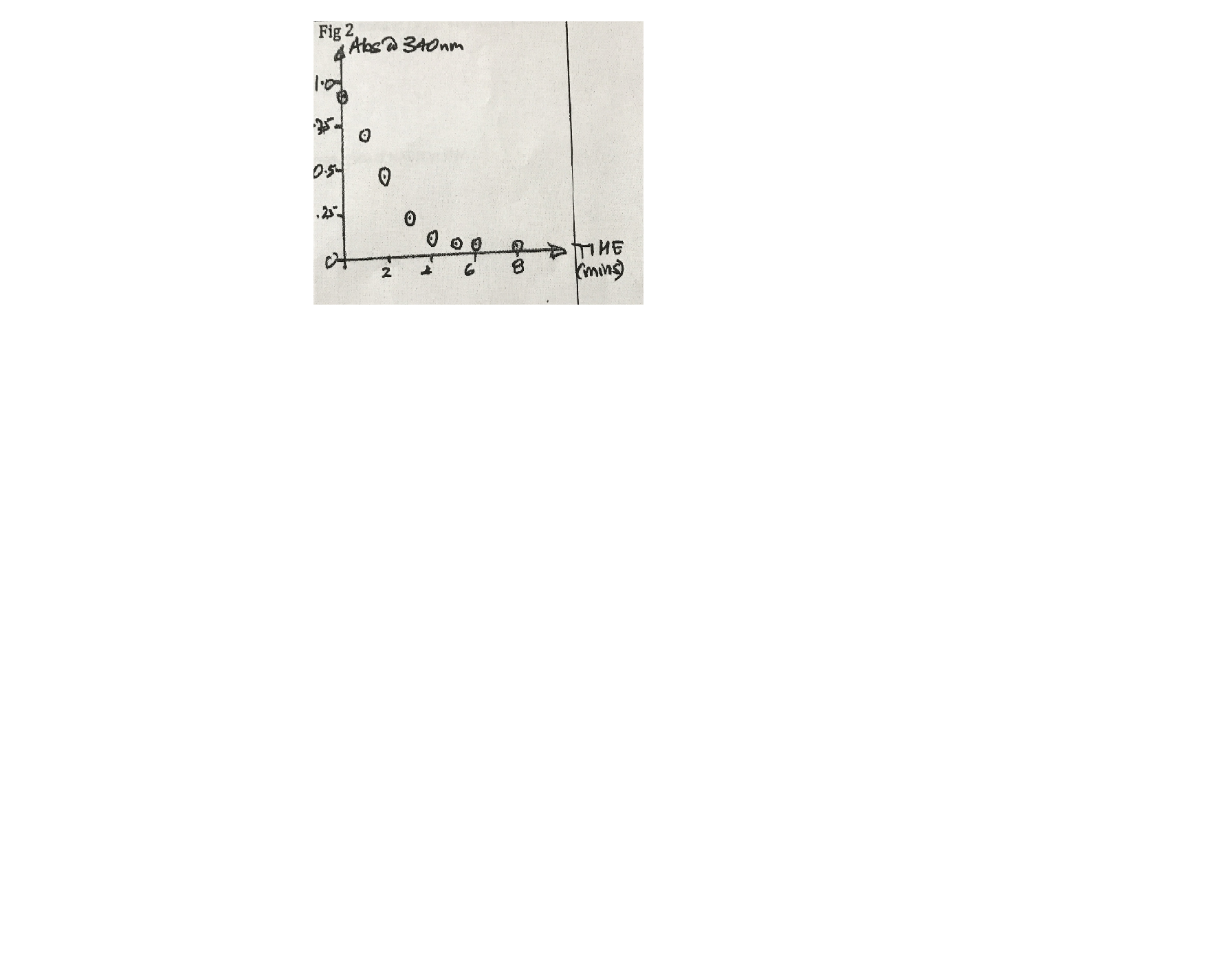 Amixture of excess lactate and NAD+ were placed in a 1cm cuvette and lactate dehydrogenase (LD) solution (this would be a serum in a clinical chemistry lab) added at t=0, Fig2 shows the plot of absobance at 340nm with time. Calculate the rate of this reaction in /L/min. Show your calculation.