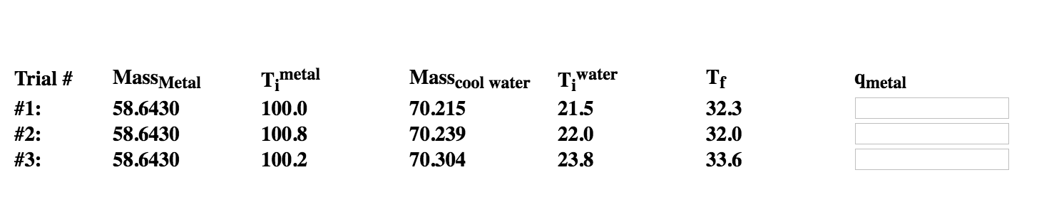 Part II. For each trial, enter the amount of heat lost by the metal, qmetal.Â