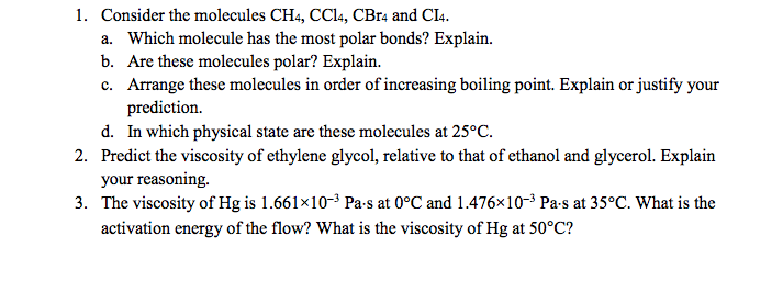 prediction. {1. In which physical state are these molecules at 25°C. . Predict the viscosity of ethylene glycol, relative to that of ethanol and glycerol. Explain your reasoning. . The viscosity :1ng is Lash: I'D—3 Pa-s at [1°C and 1.4T6X10‘3 Pa-s at 35°C. What is the activation energy of the flow? What is the viscosity of Hg at SITE?
