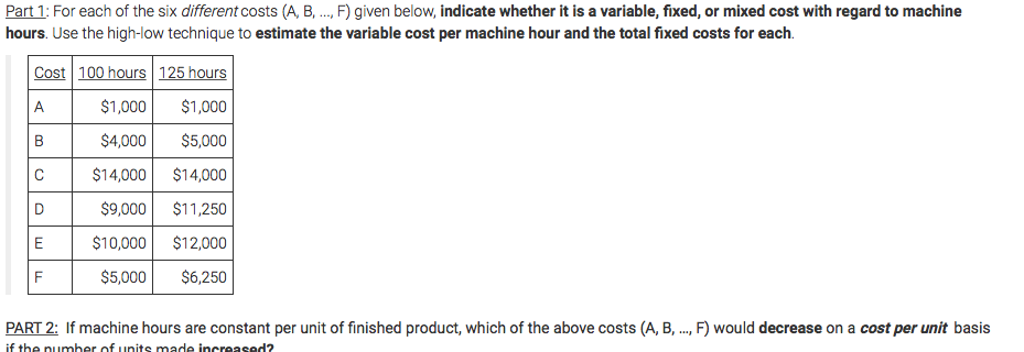 hours. Use the high-low technique to estlmate the variable cost per machine hour and the total fixed costs for each. Cost 100 hours 125 hours PART 2: If macthe hours are constant per unTt of finished product. thch of the above costs (A. B, F) would decrease an a caefperunfl basis