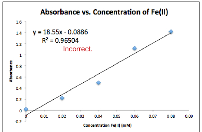 The absorbance of solution 1 was found to be 0.107 and the absorbance of solution 2 was found to be 0.837. Hint: Ferrozine is a bidentate ligand that binds to Fe (II), not Fe (III). Solution 1 will contain Fe(II) and Fe(III). When the reducing agent is added to solution 2, all Fe(III) is reduced to Fe(II). Any absorbance signal from solution 1 is due to Fe(II) species.
