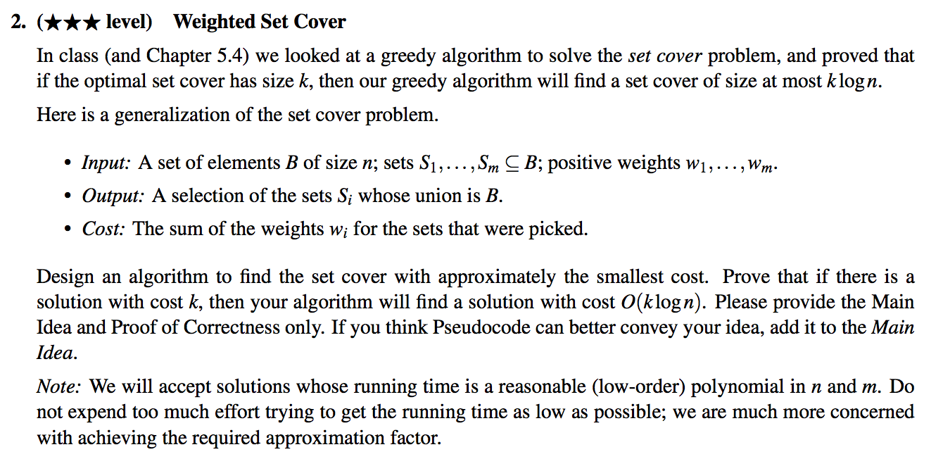 2. (*** level) Weighted Set Cover In class (and Chapter 5.4) we looked at a greedy algorithm to solve the set cover problem, and proved that